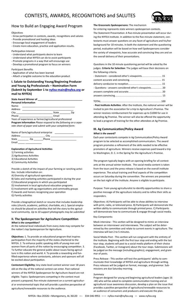 Contestant Eligibility: Any state-level contest winner over 18 years old on the day of the national contest can enter. Past national winners of the NYFEA Spokesperson for Agriculture Award are not eligible. Topics: Spokespersons competing in the contest must present a prepared, five-minute statement on a current agricultural or environmental topic that will provide a positive perspective of agriculture/renewable resources to the audience.