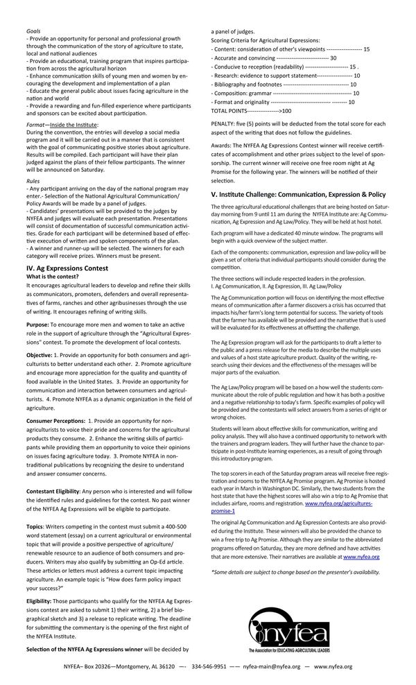 Eligibility: Those participants who qualify for the NYFEA Ag Expressions contest are asked to submit 1) their writing, 2) a brief biographical sketch and 3) a release to replicate writing. The deadline for submitting the commentary is the opening of the first night of the NYFEA Institute.